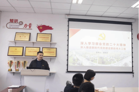 段利兵以“深入学习领会党的二十大精神,深入推进新时代党的建设新的伟大工程”为主题,从深入学习领会“党的二十大的重要意义”“党的二十大的主题”“过去五年的工作和新时代十年伟大变革的重大意义”等八个部分深入浅出地介绍了党的二十大精神概况,并结合学校党的建设工作实际,围绕上级关于高等学校基层党组织建设的要求,重点对全面加强学校党的建设进行了深刻阐述。他强调,学院基层党委(组织)要深入贯彻落实新时代党的建设总要求,切实履行全面从严治党主体责任,从加强党支部的政治建设、思想建设、组织建设、作风建设、纪律建设等方面做好新时代党建工作,特别是要强化基层党委政治功能和组织功能,切实加强党支部建设、党员活动阵地建设,着力加强基层党支部特色挖掘,形成党建品牌,以高质量党建引领学院高质量发展,在助力学校为党育人、为国育才的新征程中贡献更大力量。