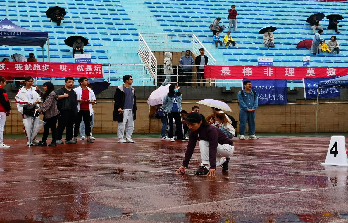 伴着微微细雨,运动会拉开帷幕。大赛开始,助跑预备,起跑枪声,挡不住老师们高涨的热情、坚定的态度、顽强的毅力。